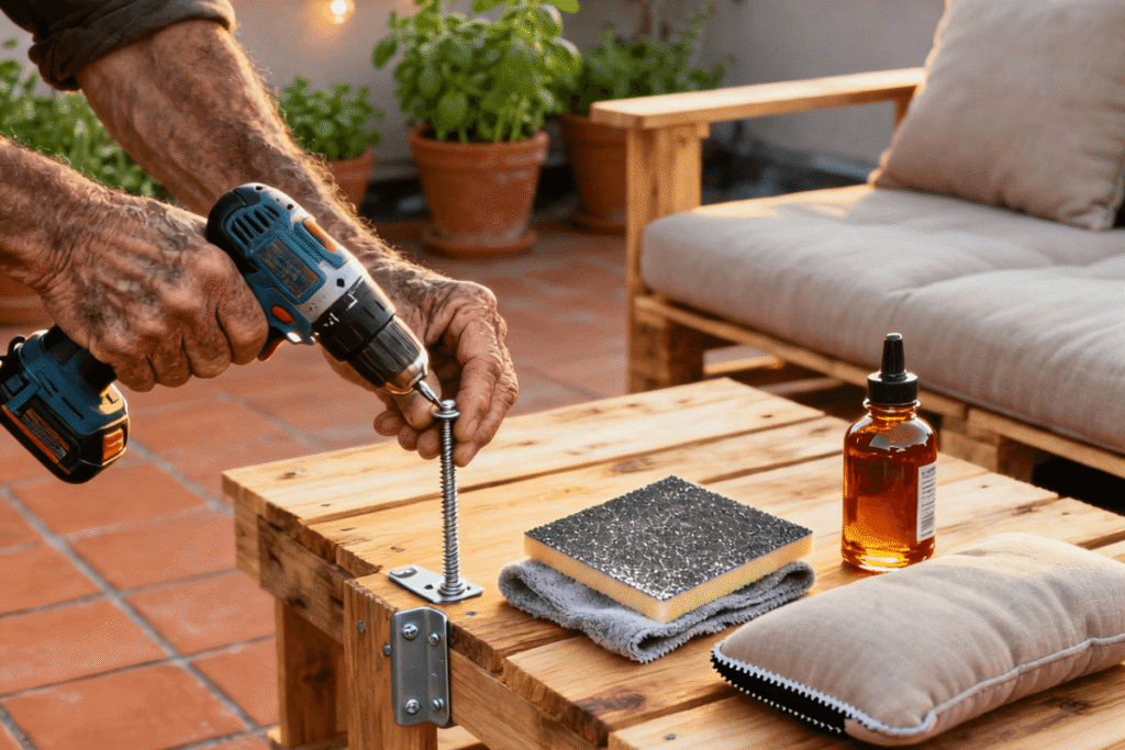 - Adding Stability: This is what separates wobbly from wonderful. Reinforce all major joints—especially where the backrest meets the base and where pallets are stacked—with heavy-duty steel L-brackets or corner braces. This ensures your sofa can handle enthusiastic lounging.